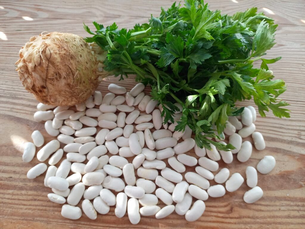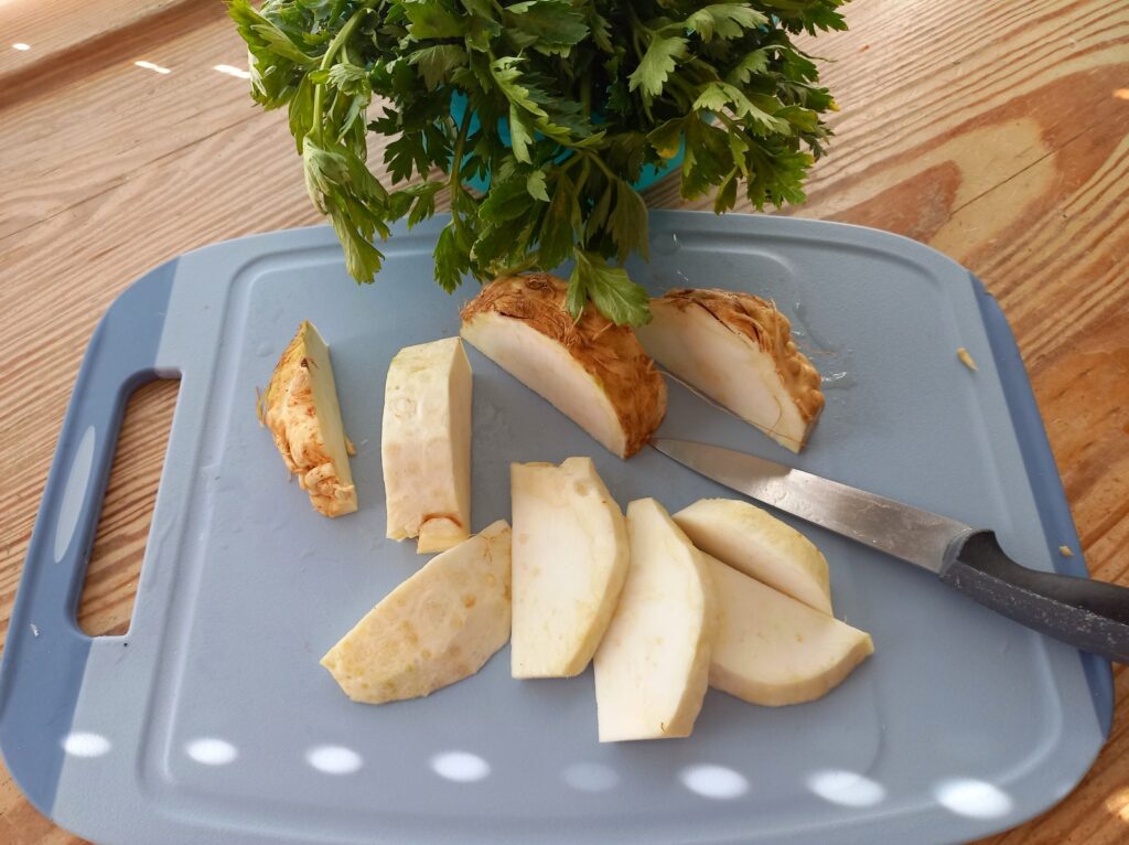 - Καθαρίζω τη σελινόριζα και την κόβω σε μισές φέτες.