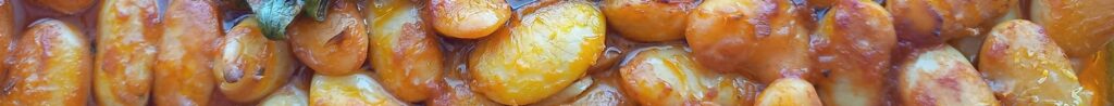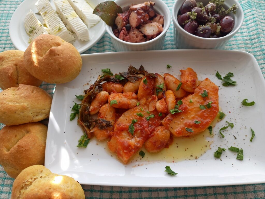 Μισό κιλό γίγαντες πεσκέσι απ’ την πηγή Καστοριά. Μια μικρή ζωντανή σελινόριζα από τη γειτονική λαϊκή αγορά. Ένα χταποδάκι που έβρασα το πρωί, ψωμάκια πικάντικα που φούρνισα την ίδια μέρα και ελίτσες ποικιλία ταράτσας απ’ τις ελιές μου, τις ηλιόλουστες, τις ταρατσάτες…