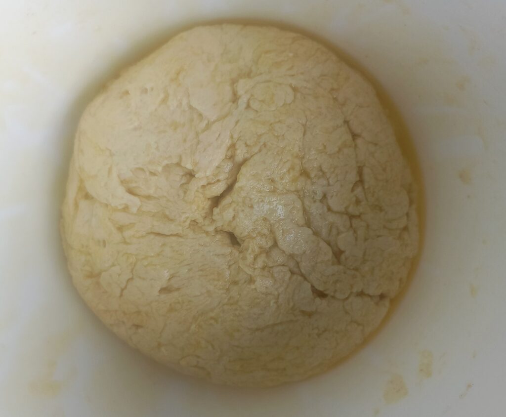 Έβαλα μόνο 300 γρ. αλεύρι και για πρακτικούς λόγους, μιας και το αποτέλεσμα φτιάχνει τόσο ψωμάκια όσα μπορούν να γεμίσουν ένα ρηχό ταψί κουζίνας.