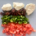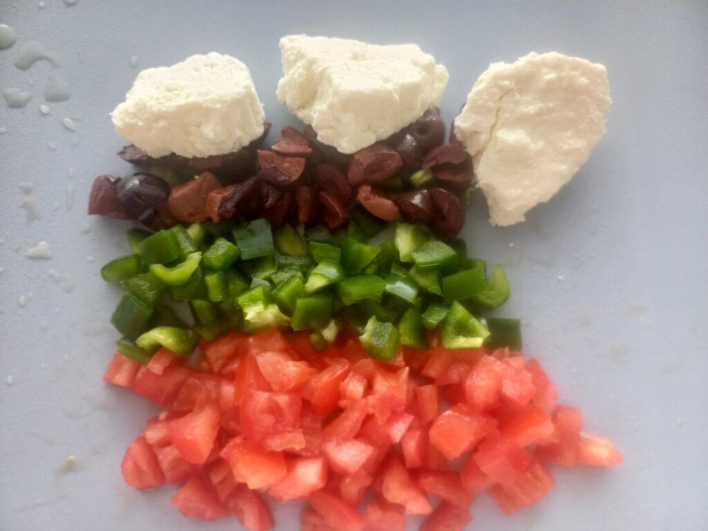 • Κόβω σε κυβάκια μόνο τη σάρκα της ντοματούλας, τη μισή πιπεριά, βγάζω τα κουκούτσια από τις ελιές και θρυμματίζω τη φέτα.