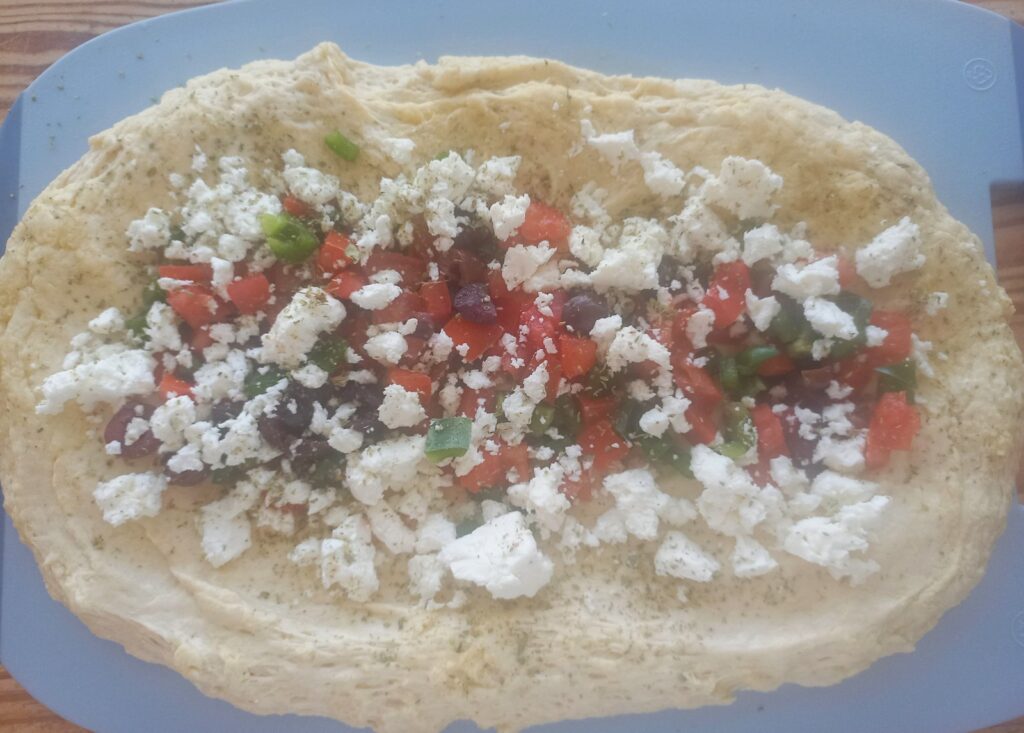 • Η ζύμη μου έχει διπλασιάσει τον όγκο της, την πατάω δυο τρεις φορές και απλώνω όλα τα υλικά της greek salad.