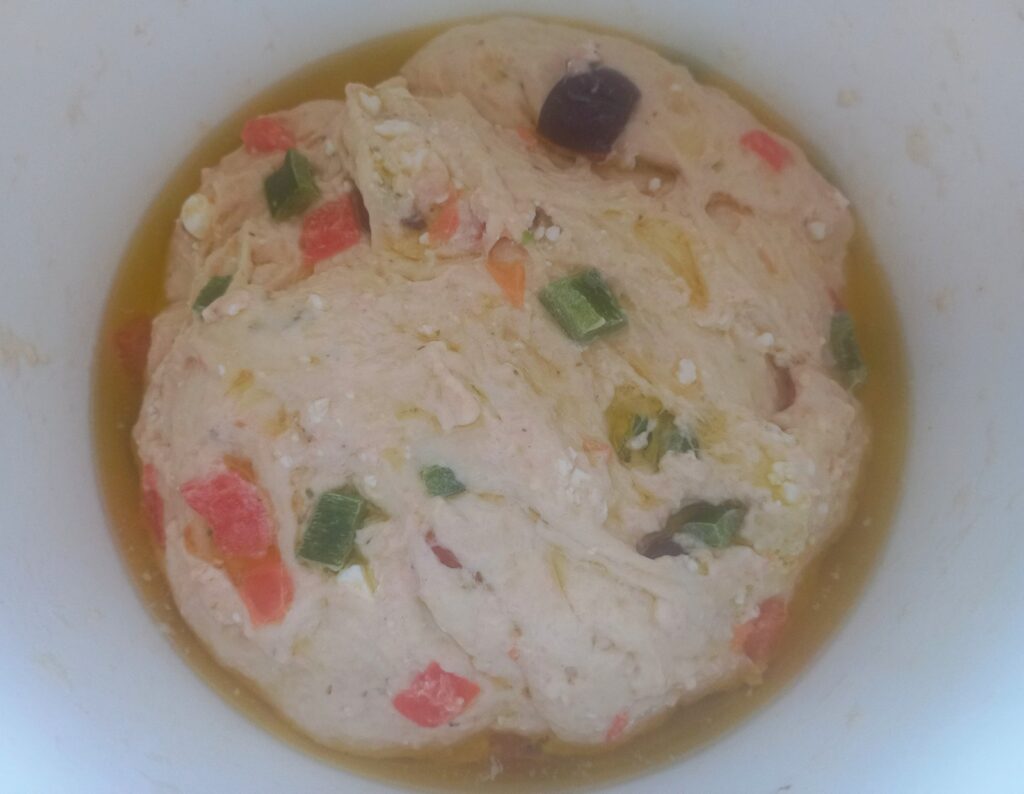 Αλάτι δεν πρόσθεσα καθόλου, μιας και η φέτα και οι ελιές δίνουν τον τόνο του αλατιού που χρειάζονται. Αν πάλι εσείς θέλετε να προσθέσετε αλάτι, παρακαλώ μόνο για ελάχιστο, υπολογίζοντας τη μικρή σχετικά ποσότητα του αλευριού.