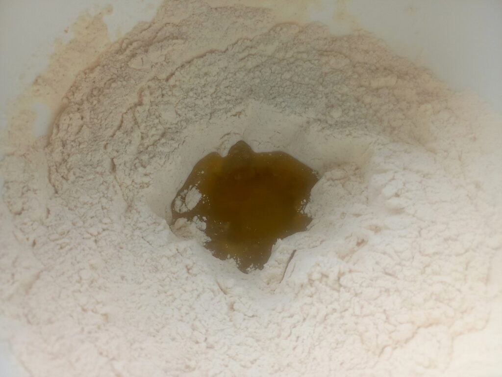 Έβαλα μόνο 300 γρ. αλεύρι και για πρακτικούς λόγους, μιας και το αποτέλεσμα φτιάχνει τόσο ψωμάκια όσα μπορούν να γεμίσουν ένα ρηχό ταψί κουζίνας.