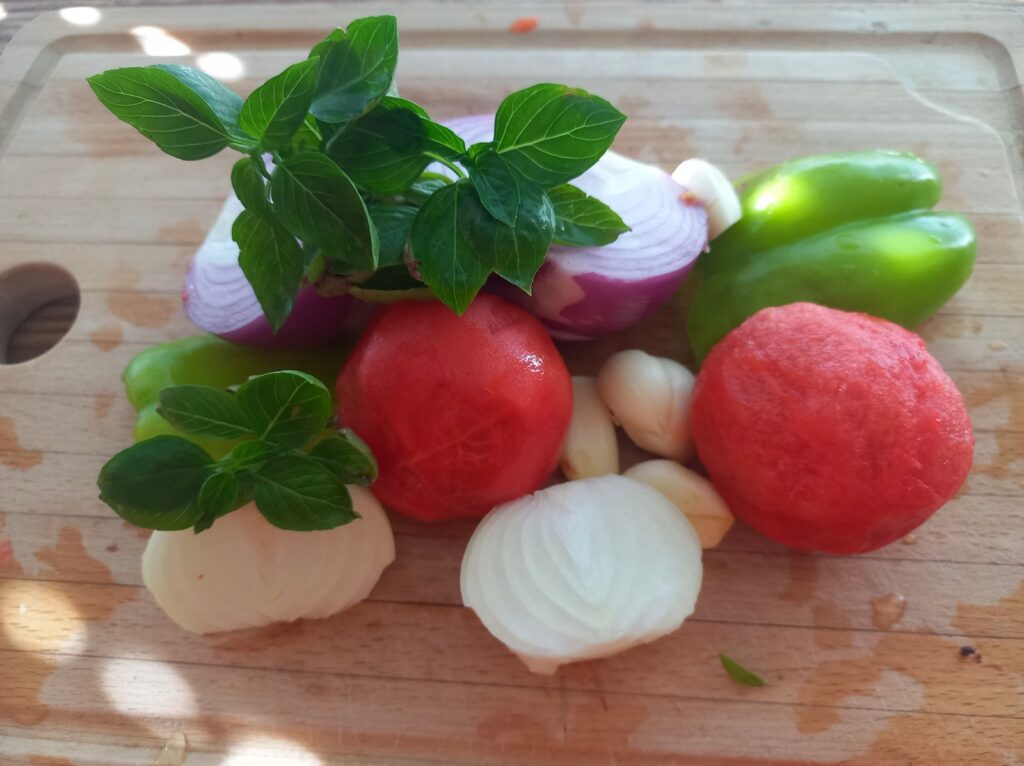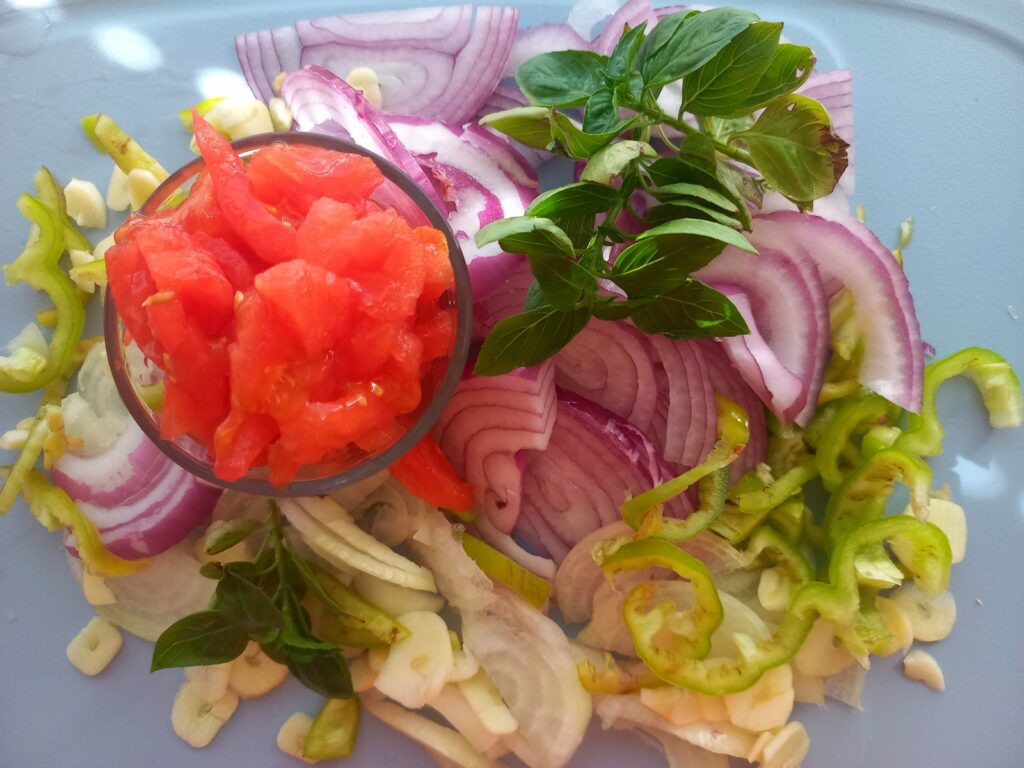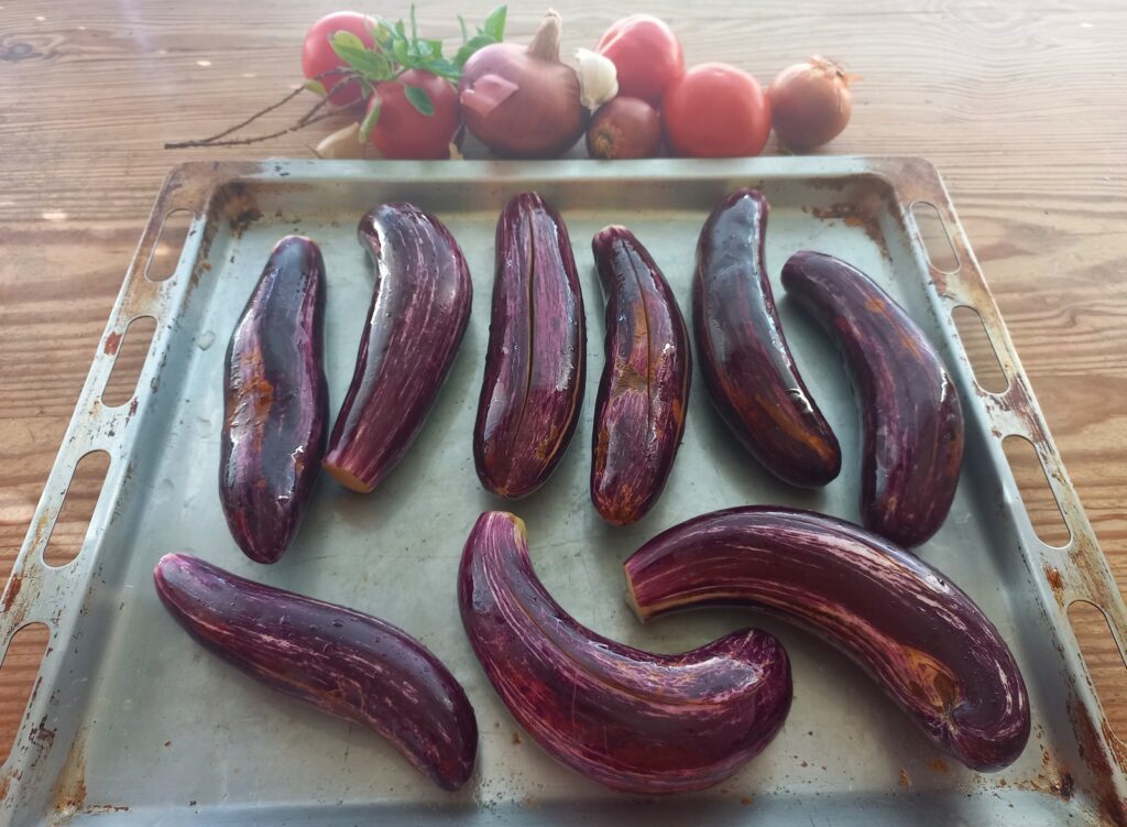 • Όσο ψήνονται οι μελιτζάνες, καθαρίζω τα λαχανικά μου, κόβω σε λεπτές φέτες τα κρεμμύδια, τα σκόρδα, την πιπεριά, ψιλοκόβω τις ντοματούλες.
