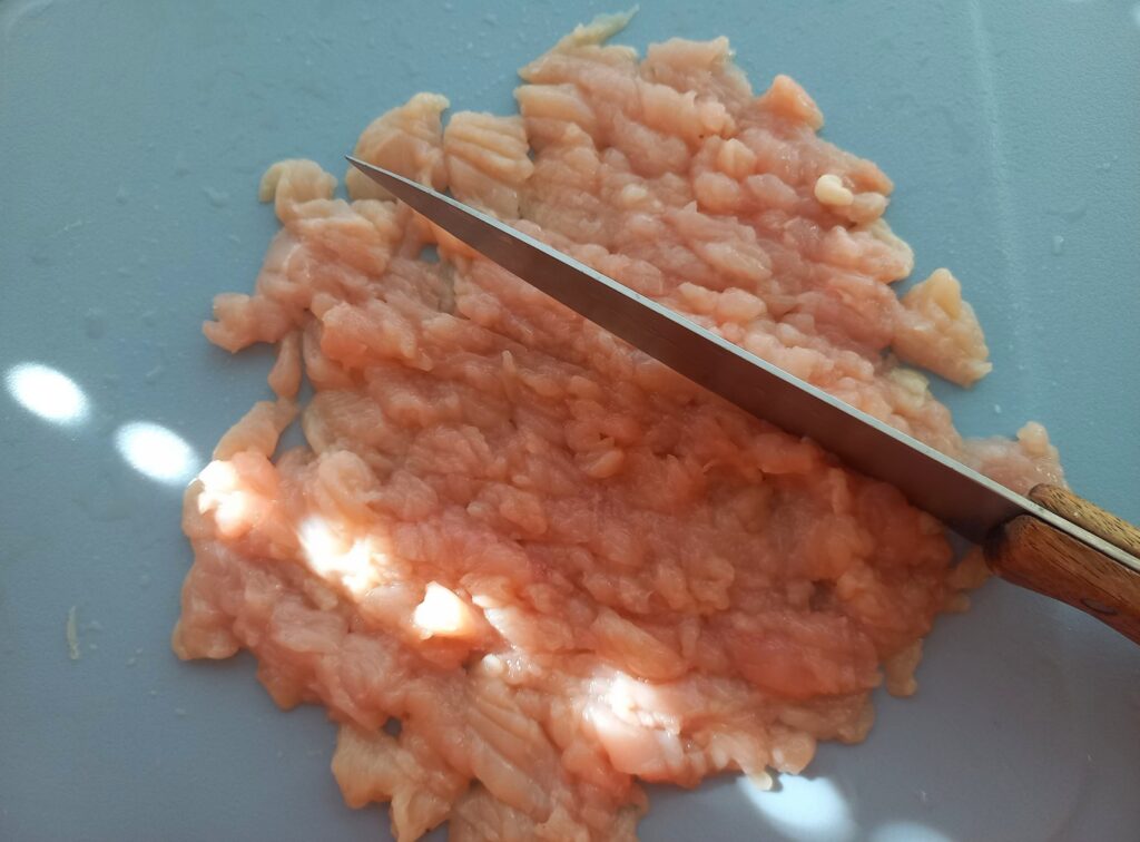 • Με κοφτερό μαχαίρι ψιλοκόβω το στήθος, σαν χοντροκομμένο κιμά.