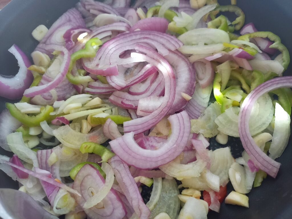 • Σε φαρδύ τηγάνι βάζω πρώτα τα κρεμμύδια, τα σκόρδα και την πιπεριά. Ρίχνω τη ζάχαρη, αλάτι, πιπέρι. Σοτάρω με αρκετό ελαιόλαδο ώσπου να πέσει ο όγκος τους.