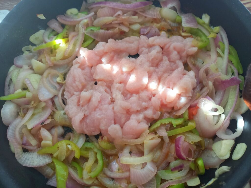 • Ρίχνω το ψιλοκκομένο στήθος. Ανακατεύω. Τελευταία ψιλοκκομένο βασιλικό.