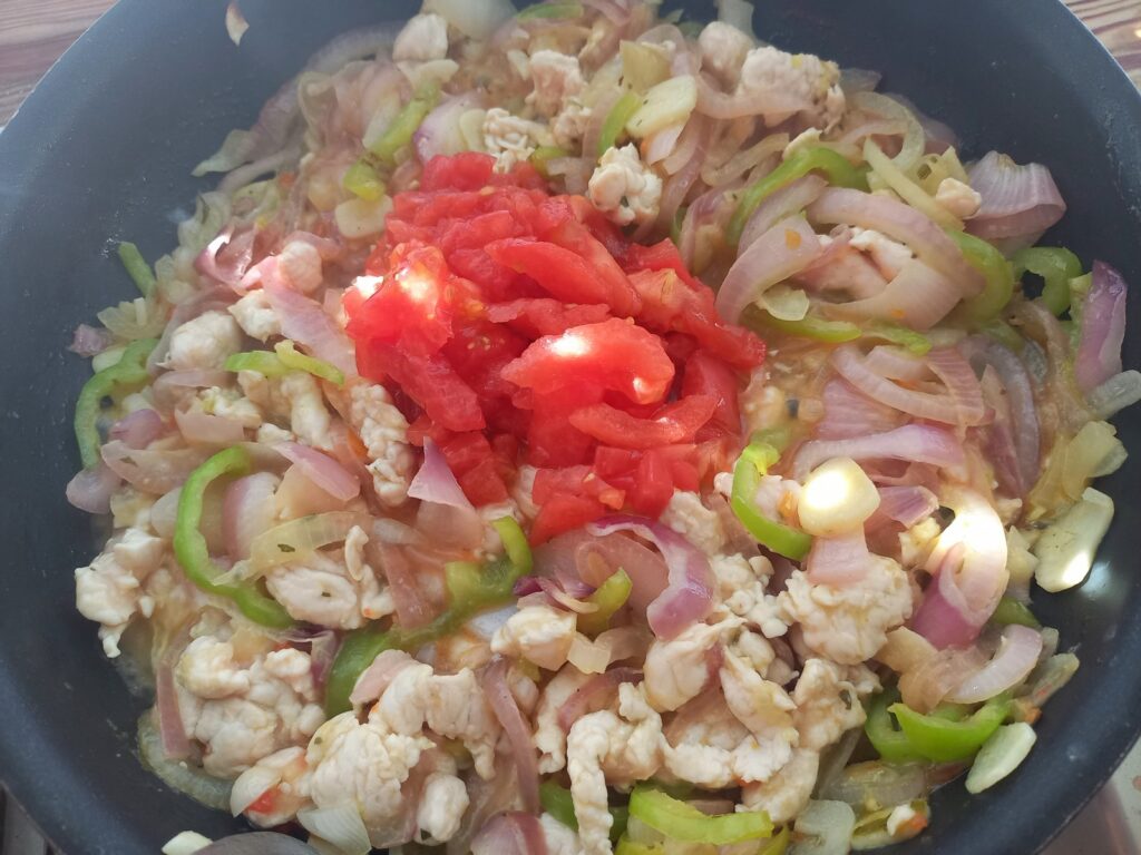 • Ρίχνω τις ψιλοκκομένες ντομάτες και ανακατεύω καλά.