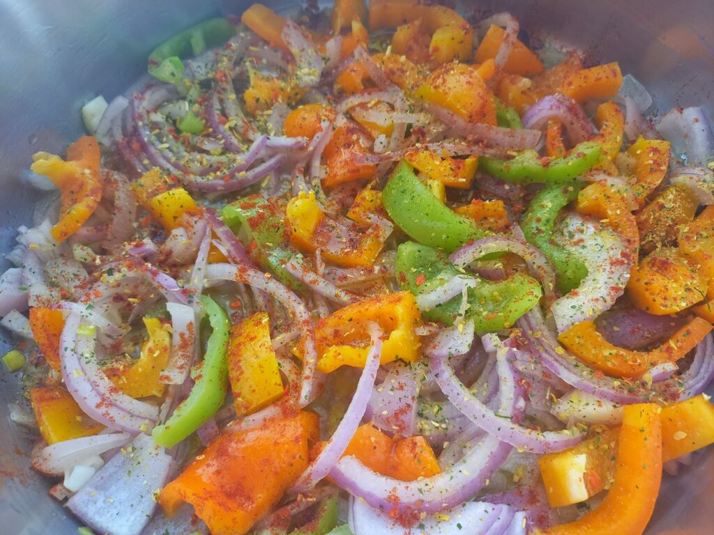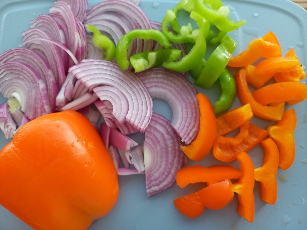 - Κόβω σε φέτες τις πιπεριές και το κρεμμύδι.