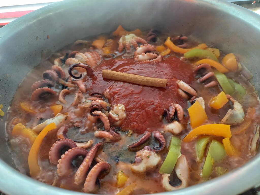 - Όταν πέσει ο όγκος τους, σβήνω με το κρασί, προσθέτω λίγο ζεστό νερό, το χυμό της ντομάτας, τη βεγκέτα, την πάπρικα και την κανέλα. Σε σιγανή φωτιά αφήνω το φαγητό να σιγοψηθεί ώσπου να μαλακώσουν οι μοσχοί.