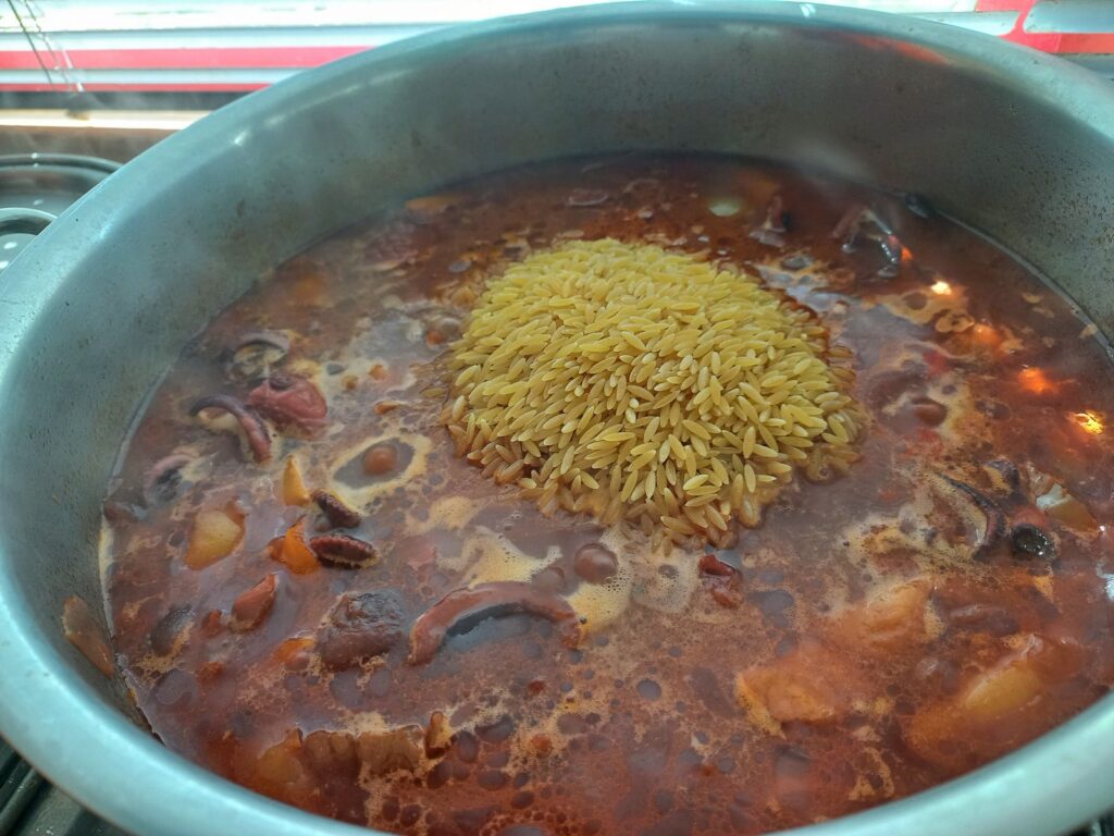 - Προσθέτω το κριθαράκι, ανακατεύω και αφήνω ώσπου να γίνει μελάτο, αλλά με λίγα ζουμιά. Πασπαλίζω με μαύρο πιπέρι.