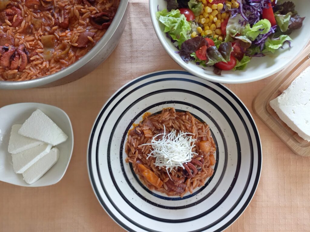Μια πλούσια σαλάτα, φέτα και ανθότυρο, κόκκινο κρασί και βεβαίως home made πικάντικα ψωμάκια.