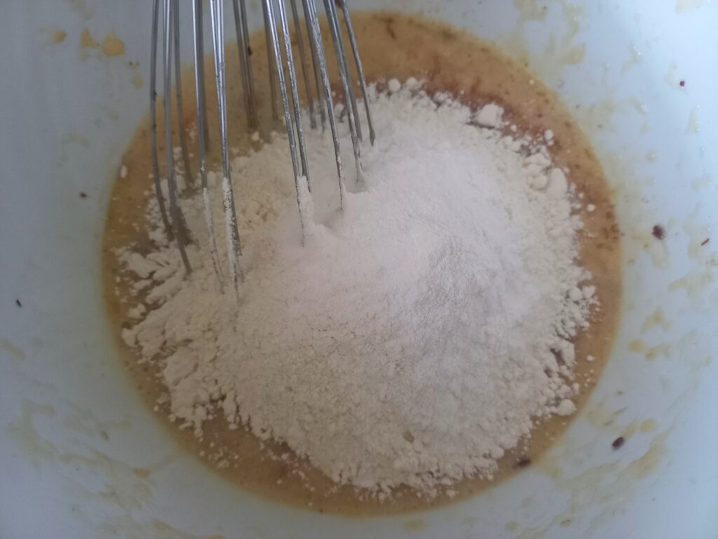 - Προσθέτω λίγο αλεύρι και ενσωματώνω με τα υλικά.