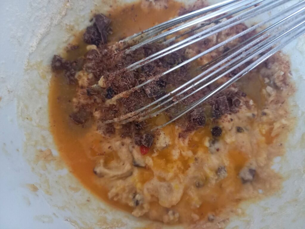 - Σε ένα μπολ μεγάλο βάζω τις μπανάνες μαζί με τα αβγά και λίγη σοκολάτα. Με τον αβγοδάρτη χειρός λιώνω τις μπανάνες και ταυτόχρονα ανακατεύω με τα αβγά και τη σοκολάτα.