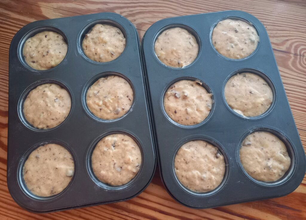 - Λαδώνω ελαφρά τις δώδεκα θήκες για μάφινς, τις αλευρώνω και μοιράζω το χυλό σ’ αυτές.
