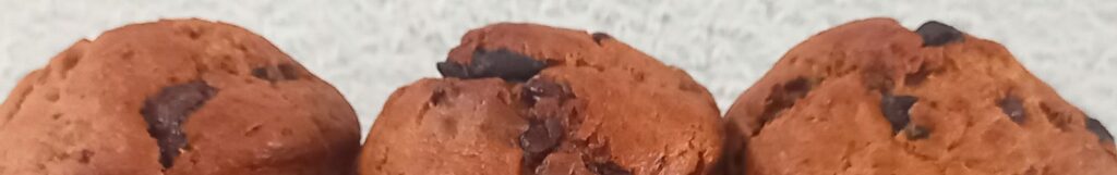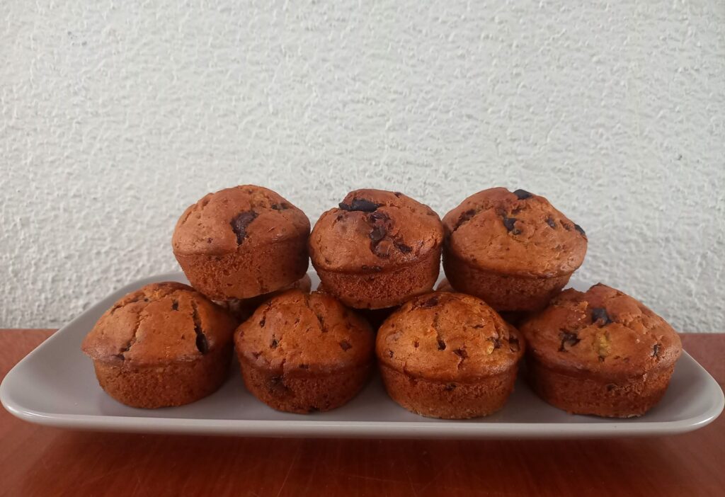 Δυο ώριμες μπανάνες, κουβερτούρα γάλακτος, κάτι λίγα αποξηραμένα μούρα και να η βασική σύνθεση για μάφινς χωρίς καθόλου ζάχαρη στο φούρνο μου.