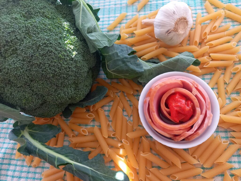 • Όσο βράζουν οι πέννες, κόβω μπουκετάκια, τα 3/4 (ή όσο θέλετε) από το μπρόκολο. Καθαρίζω τις σκελίδες σκόρδου. Κόβω το μπέικον σε κομμάτια.