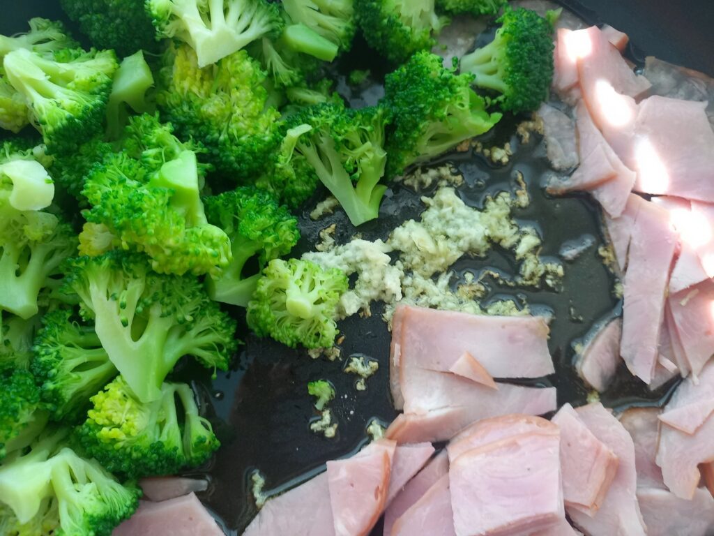 • Σοτάρω αρχικά, σε αρκετό ελαιόλαδο, για 1 λεπτό τις πολτοποιημένες σκελίδες, ρίχνω αμέσως τα ζεματισμένα μπουκετάκια αφού τα έχω στραγγίσει πολύ καλά. Προσθέτω το μπέικον. Ανακατεύω καλά.