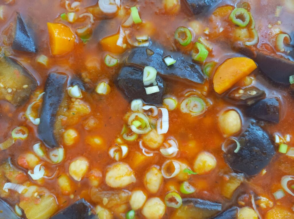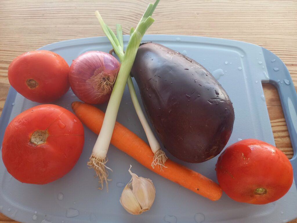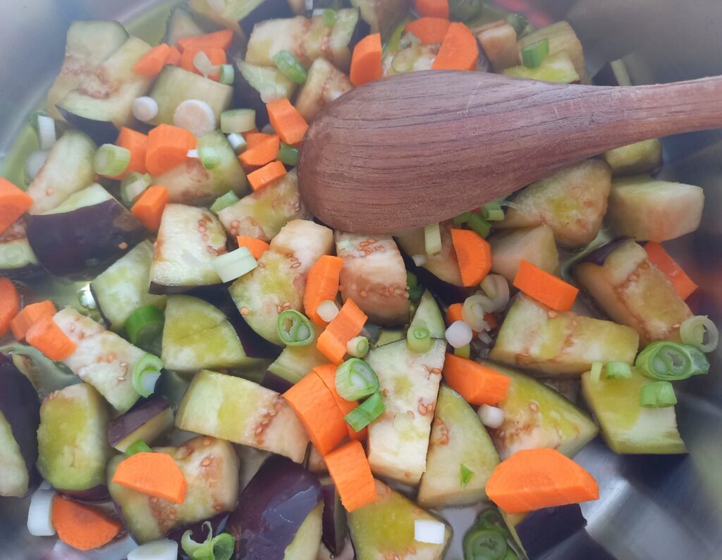 - Σε μεγάλη χαμηλή κατσαρόλα ρίχνω ελαιόλαδο και όλα μαζί τα ψιλοκομμένα λαχανικά. Τη μελιτζάνα, το καρότο, τα φρέσκα κρεμμυδάκια. Σοτάρω καλά ώσπου να πέσει ο όγκος τους.