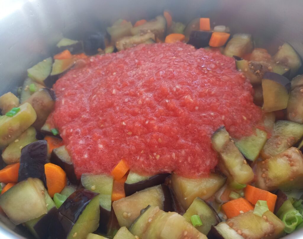 - Προσθέτω την τριμμένη ντομάτα με το κρεμμύδι και τα σκόρδα. Ρίχνω και το ζωμό λαχανικών. Ανακατεύω απαλά. Αφήνω σε χαμηλή θερμοκρασία ώσπου να γίνουν αλλά όχι να λιώσουν.