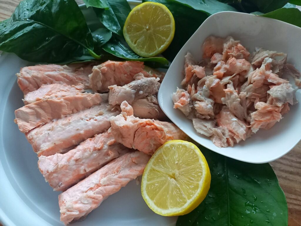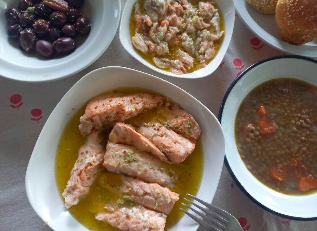 Αυτή τη φορά και αντί να συνοδέψω τις φακές μας με κάποια κονσέρβα ψαριού ή μικρά τηγανιτά ψαράκια, έβρασα κεφάλι και ουρά του σολομού, τα περιέλουσα με μια πικάντικη έως καυτερή σάλτα λαδολέμονου και τα έβαλα παρέα με τις αγαπημένες φακές που πολύ τακτικά τις έχω στο τραπέζι μας είτε σαν σούπα, είτε σαν σαλάτα.