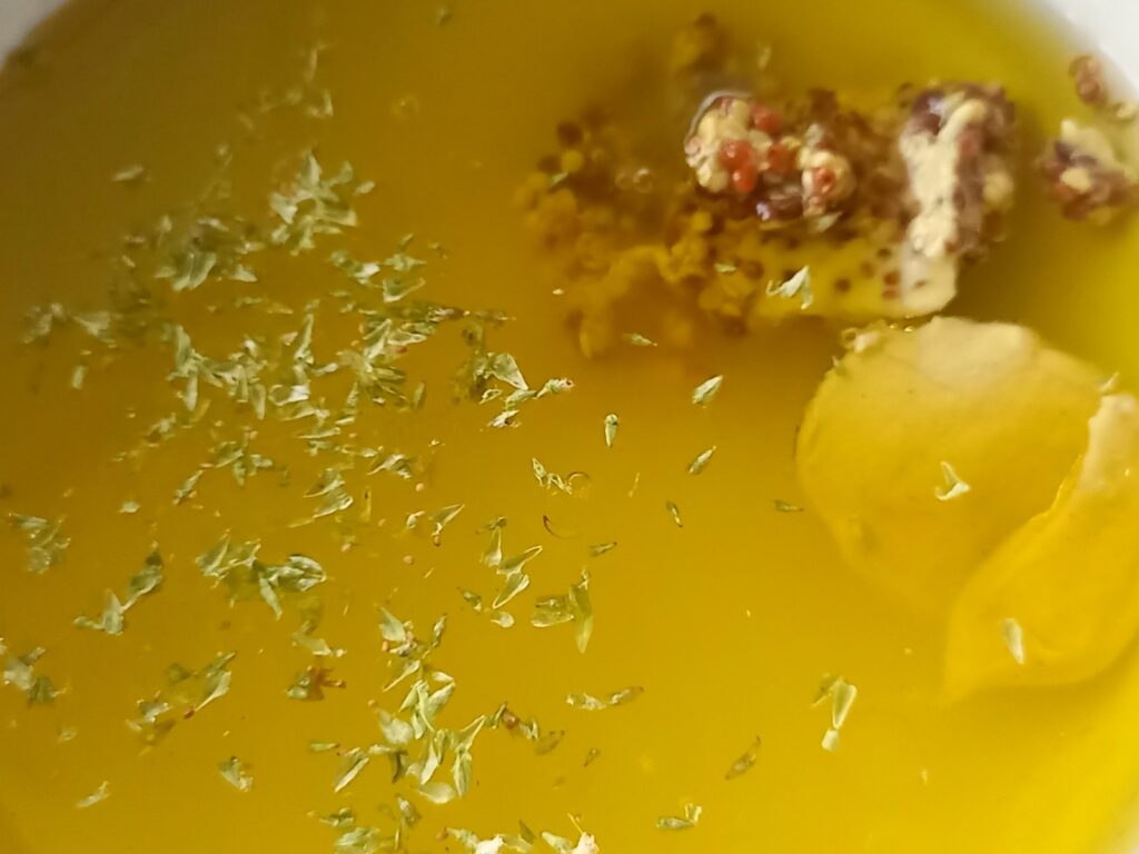 • Σε ένα μπολάκι ρίχνω αρκετό ελαιόλαδο, το χυμό του λεμονιού, τις μουστάρδες και τη ρίγανη. Ανακατεύω πολύ καλά.